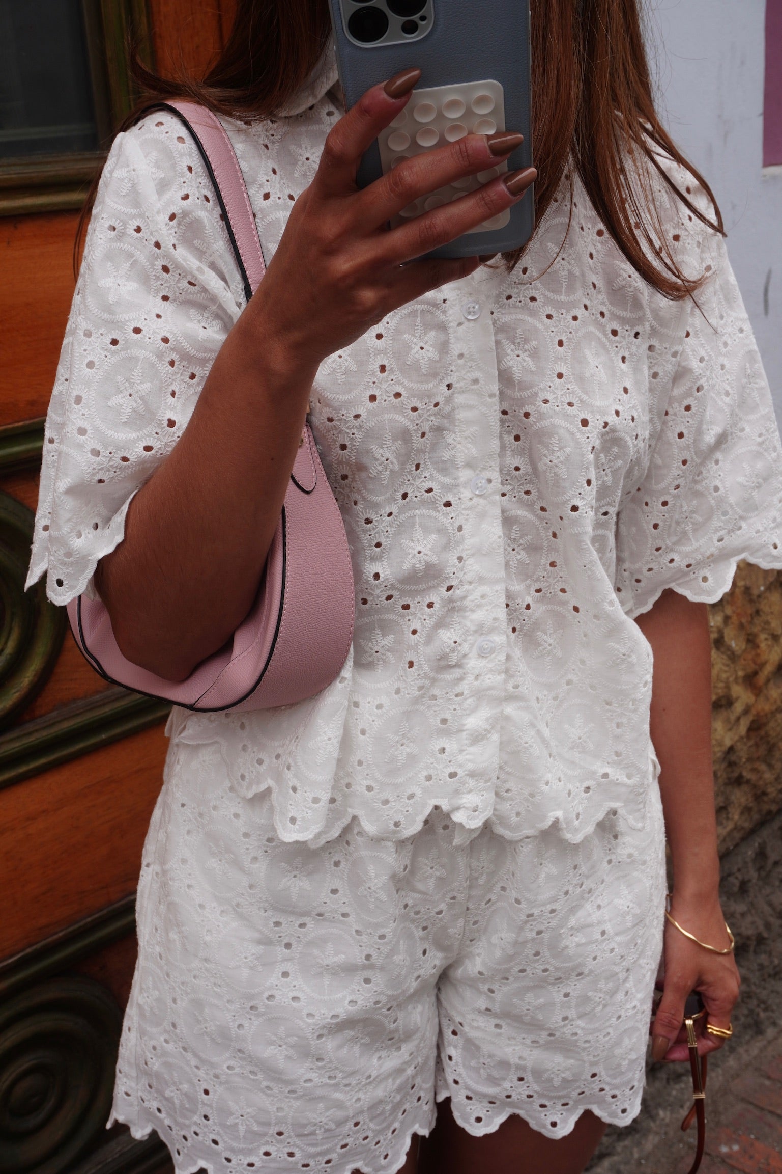 Femenino y fresco como una mañana en las calles de la Candelaria. Este set en ojalillo bordado combina una camisa de botones y un short forrado con bolsillos, ambos terminados con delicados cortes que enmarcan su silueta. Un diseño pensado para nuestras girls que encuentran en lo cotidiano la oportunidad de brillar, llevando la ciudad con suavidad y un toque romántico.