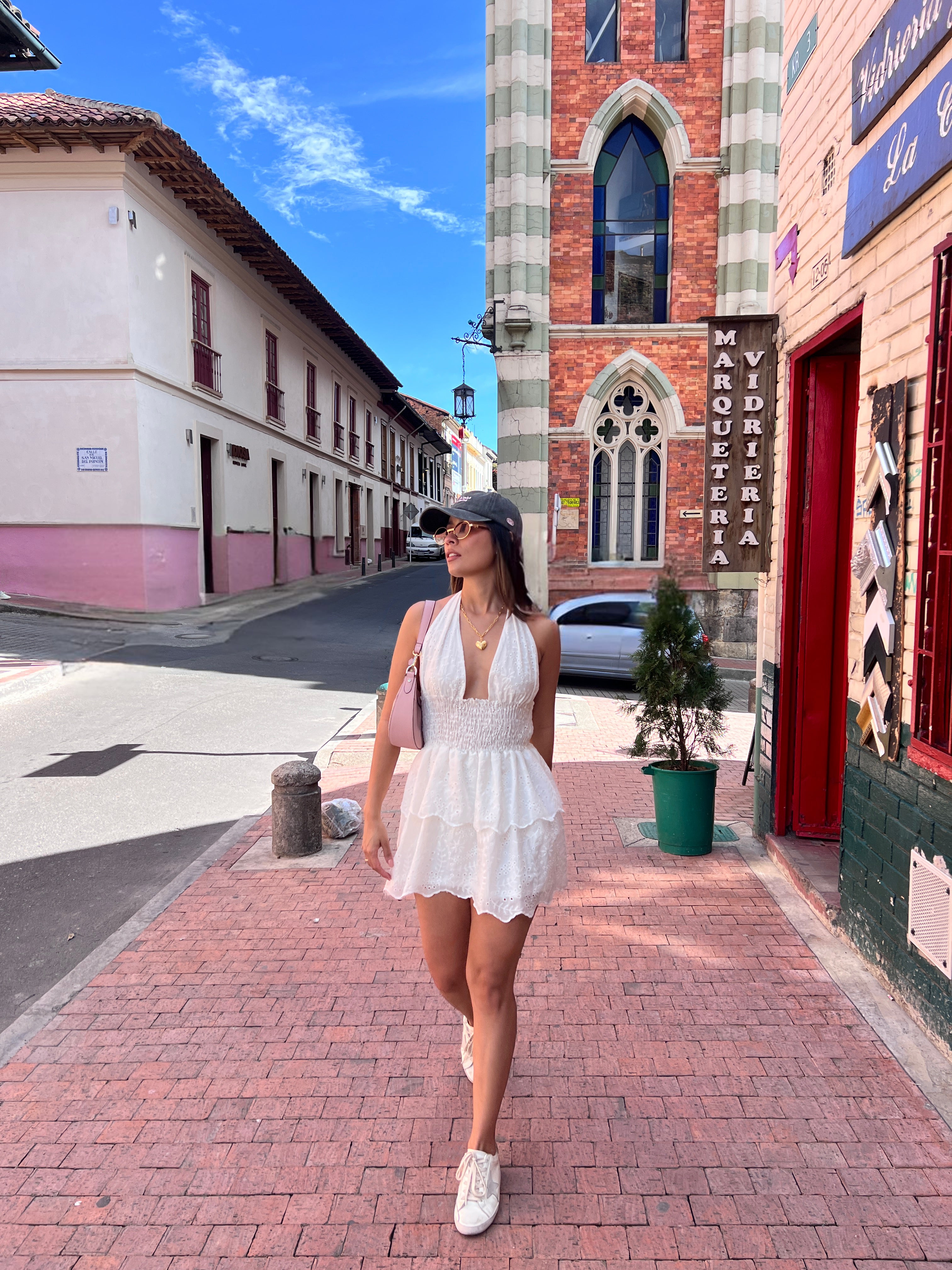 Romántico, femenino y absolutamente inolvidable. Nuestro vestido está elaborado en ojalillo 100% algodón, con escote profundo en halter, sutil amarre en cuello para ajuste perfecto, y espalda descubierta. Silueta entallada en cintura, y falda con volantes en capas, crea un movimiento etéreo que acompaña cada paso. Llévalo con texanas, ballerinas, flats, el estilo lo creas tú.