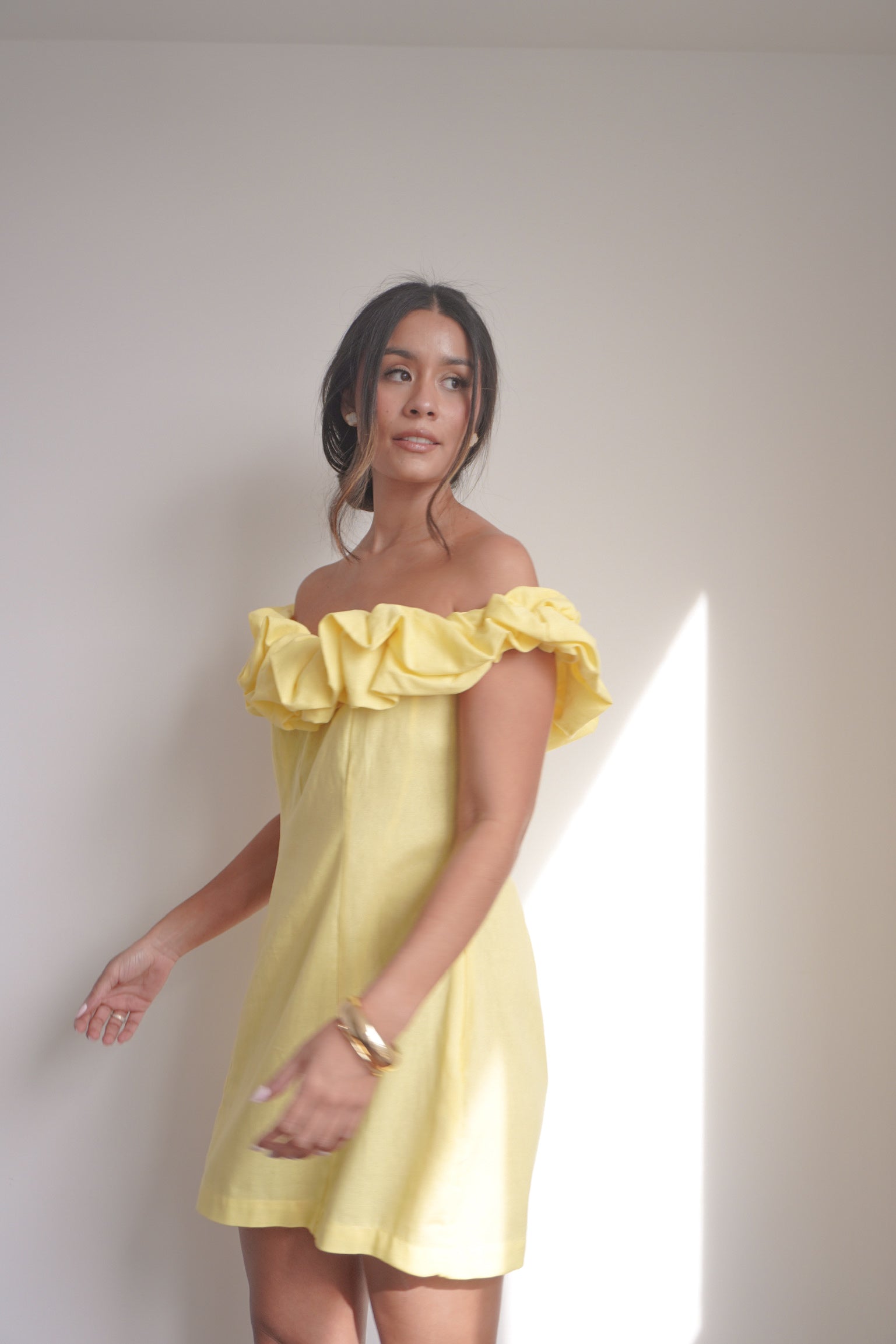 Vestido corto en lino color amarillo y rosa claro, con diseño de hombros descubiertos y detalle de volantes alrededor del escote que aporta un aire femenino y sofisticado. Su silueta ligera y fresca lo convierte en la opción ideal para días soleados o eventos casuales con un toque elegante.